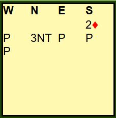 Med alle i sonen og syd som giver åpnet syd med 1 hjerter før vest hoppet inn med 2 spar (svakt innhopp). Nord meldte 3 spar som var definert som en god 4 hjertermelding. Det endte i 6 hjerter. Omtrent sånn gikk meldingene ved mange bord. Mange par kom altså i 6 hjerter, men spilleføringen gikk på ingen måte likt rundt omkring i salen.