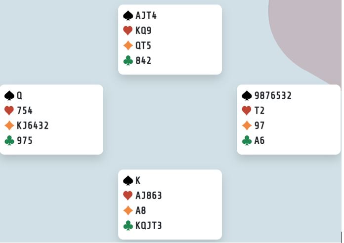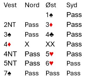 Østs 3 ruter var naturlg, og over den meldingen sa Ranja 3 spar som var en hvilemelding og spurte etter mer informasjon. Kåres 4 kløver viste kortfarge i kløver. Nå begynte det å bli lite tapere hos øst syntes Ranja, og hun fortsatte med 4 ruter - kontrollmelding. Da doblet nord, og redoblingen viste førstekontroll. Da kom Key Card 4NT med svaret to nøkkelkort hos øst, og 5NT var storeslemsinvitt som også spør etter spesifikk konge. Øst viste hjerter konge. Hva visste Ranja nå?