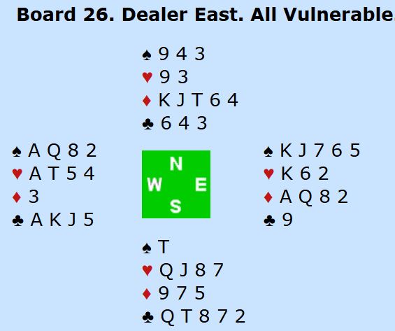 Stokkeland-Johnsen fant frem til 6 hjerter etter en lang meldeserie som startet med sterk kunstig kløveråpning av syd. Kanskje burde vest vært med og forstyrret mot sterk kunstig 1 kløver? Eller øst? Det var de ikke, og det norske paret hadde god styring på meldingsforløpet; resultat: 6 hjerter med tolv stikk og NORWEGIANS +1430.