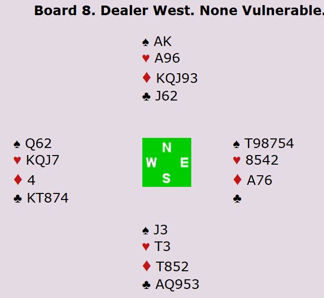 Østnhar minst 5-4 i spar og ruter. Kløver konge gir ett avkast for en hjerter hos lst, og østs hjerter konge gjør derfor at det ikke finnes tapere, for østs smårutere kan trumfes hos vest. Konklusjon: 7 spar!