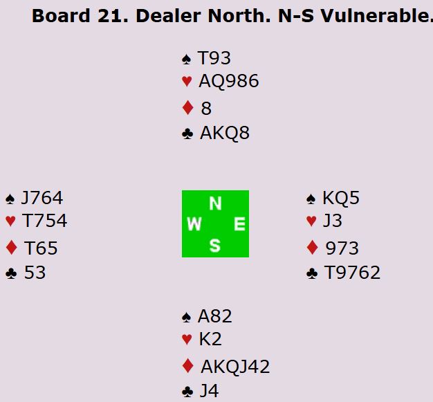 Det kan jo når syd vet om minst A-Q femte i hjerter og kløver ess godt være 11 røde stikk og to ess (for eksempel kan nord ha hjerter knekt også). Vel, mye av dette handler om avtalespørsmål. Og det var tydelig ikke alle hadde disse tingene helt avklart, for svært mange fant ikke frem til storeslem som er glimrende. Det er tretten stikk om ruteren ikke sitter verre enn 4-2 (84% for at det sitter enten 3-3 eller 4-2), og om ruteren sitter 5-1 eller 6-0 står 7NT likevel om hjerteren sitter 3-3. Med andre ord har 7NT omtrent 90% sjanse!