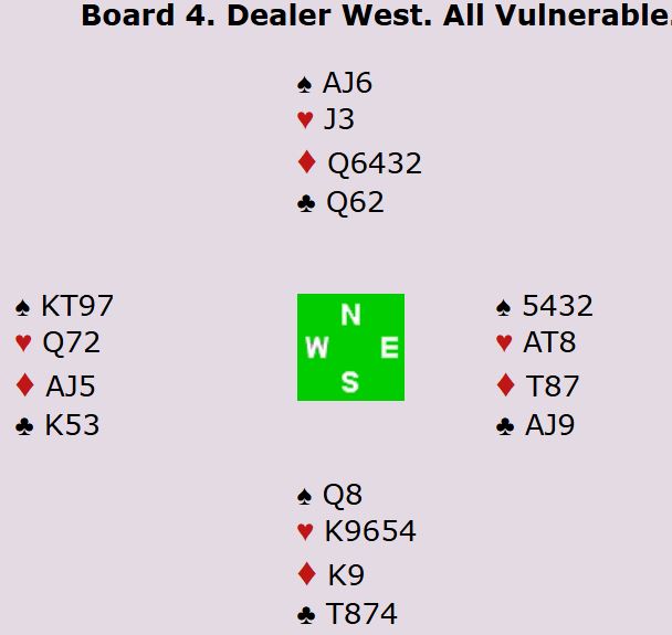 I det spillet vi så på var det rundt 2/3 av Ø/V parene som gikk i pluss, det fleste i kontrakten 2 spar med åtte eller ni stikk. Bakke-Brogelands +300 som Ø/V var "room-top".