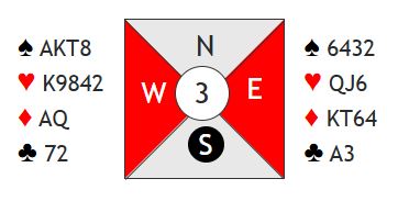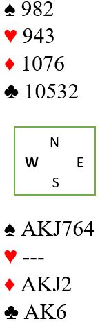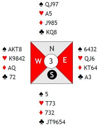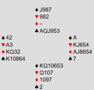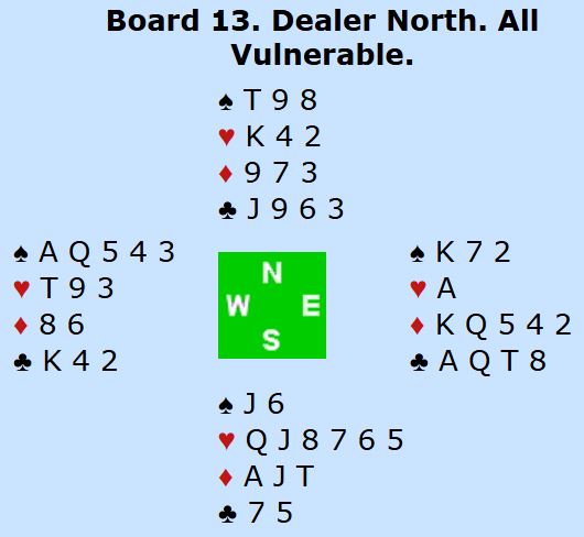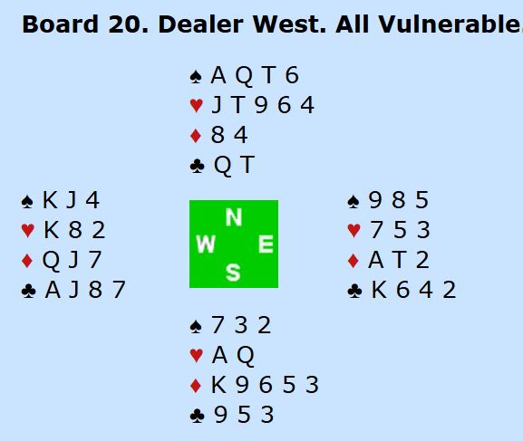 I hjerterkontrakt er det kun en taper i trumf og en i kløver i tillegg til at det blir bare en spartaper, for fra vest kan en spar kastes på ruter konge. Kun ett par var i 4 spar. De vant den etter hjerter ess i utspill som gjorde at N/S ikke fikk kløverstikk, det var inntak til øst for å hente ruter konge og kaste kløver fra vest. Om det spilles ut kløver får ikke spillefører kommet seg over for å tatt det avkastet. Det var en lang rekke +620 i hjerterutganger, og det ga middels. Noen få par fikk fatt i ett overstikk og noterte med det 60%. Ett par fikk 70% for +660 i 3NT, en kontrakt som er håpløs om det kommer kløver ut.