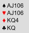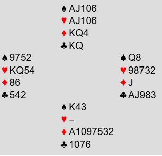 Uforståelig nok, vest spilte ut ruter 7 (norsk fordeling) ved det bordet også. Det gikk ruter 9, 10 og konge fulgt av spar ess og mer spar til vests konge. Det kom nok en ruter (!) til esset. Rutersitsen var nå på det nærmeste klar uten at det hjelper noe, det ser uansett ut til å være fire uungåelige tapere. Vest må ha rutersyveren dobbel, for om han hadde startet med fire ruter ville utspillskortet - syveren - vært det nest høyeste kortet. Inne på ruter ess ble kløver 10 spilt til vests ess. Han spilte mer kløver til østs konge. Ingen ting som koster noe har egentlig skjedd så langt, og de vil fortsatt få ett hjerterstikk mot slutten - betestikket - ikke sant?