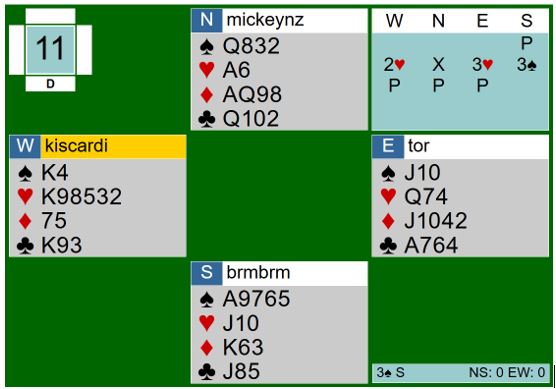 Mot oss åpnet vest med 1 hjerter som for dem viser 8-14 poeng. Nord doblet, og øst sa 3 hjerter, 3 spar fra syd. Nå la nord på til 4 spar, en tvilsom avgjørelse selv om han har et par HP på lager. Syd behøver ikke ha mer enn firekorts spar, og selvsagt ikke kort som gode nok til utgang. Hvis 4 spar skal være bra her må syd ha gode nok til å melde det selv.