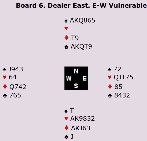 Nei, det kom hjerter ut mot 7 spar, og da er det en mirakel bet såvidt jeg kan forstå. Det er jo bare å ta ut trumfen før kløveren prøves, og idet den ikke ordner seg må syd har ruter konge for at det skal bli tretten stikk. (Det blir for øvrig en show-up skvis i ruter og kløver om man etter tre runder kløver tar resten av trumfene).