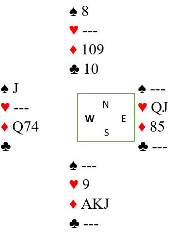 Om dette hadde vært lagkamp så ville spilleføringen kun vært interessant i 4NT, for det er jo ni sikre stikk i NT uansett rutersits. I 4NT må man få fatt i ett ekstra stikk i ruter. Etter hjerter ut til esset og kløver tilbake kan det en sjelden gang bli bet i 4NT om en ikke spiller safe. Safevarianten er ruter ess, så over til syd og liten ruter. Om vest følger med liten legges nieren. Ryker den til østs tier sitter fargen 3-2 og resten av ruteren står. Men om vest har D-10-x-x har man sikret seg det niende. Sitter det sånn vil å spille A-K gå galt. Vest får i så fall to stikk i ruter og rekker å godspille ett stikk i kløver før spillefører har gått godspilt det tiende stikket. Og om øst har D-10-x-x i ruter oppdages det idet liten ruter spilles mot nord i andre ruterrunde. I så fall stikkes med esset fulgt av ruter mot knekten som godspiller fargen.