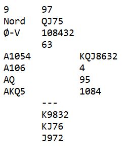 Det var en lang rekke med +660 for utgang i grand med elleve stikk. Det eneste paret som fikk tolv stikk og ren topp var paret som ble nr. 2, Nordby-Bang. Ett par var i 6NT og spilte på beste sjanse ved å toppe ruteren. Da ble det en bet og ren bunn! Litt utur for dem kanskje? Nei, for det være svært heldig å vinne 6NT, for slemmen har for liten sjanse om en ser kun på N/S sine kort.