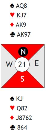 Kontrakten bør bli 3NT eller kanskje 4NT med disse N/S-kortene. Nord har en super hånd, 24 HP og "rene" honnører, men også flat fordeling. Noen viste 22-24 NT, andre 24-26 alt etter systemavtaler, eller kanskje enkelte oppvurderte (hardt) til 25-27. Om nord viser 22-23 (24) har ikke syd til å tenke på slem. Men om syd får høre om 24-26 kan det være en bra slem, men det er det ikke så ofte med 31-32 til sammen og to balanserte hender. Så mot en 24-26 hånd er det nok å høyne til 4NT som kvantitativ høyning (invitt), og da har ikke nord til å ta imot invitten.