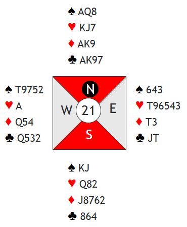 Dennis Bilde og Martin Schaltz satt N/S og fikk utlevert disse monsterkortene. Det er umulig å vite finne ut med sikkerhet hva som skal spilles, men på et tidspunkt i meldingsforløpet hoppet Bilde (nord) til 7 kløver og ga Schaltz valget mellom 7 kløver og 7 spar. Schaltz passet og de var havnet i en sjelden storslem med 5-1 i trumf! Den står enkelt om det kommer alt annet enn trumf ut siden en spar kan stjeles med den single trumfknekten, og nords hånd har deretter bare ståstikk bortsett fra to små ruter som syds ruter A-K dekkler opp.