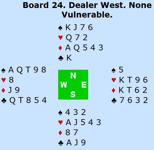 Hjerter dame ble spilt til kongen og esset. Så spar mot nord til liten fra vest, og knekten vant det stikket. Nå dukket Allan en hjerter til øst (vest kastet spar 9) som etter å ha fått det hjerterstikket fortsatt hadde en stopper til i fargen. Nå var motspillet kritisk. Øst hadde uten å vite det funnet et veldig godt utspill. Men han visste fortsatt ikke hvilken minorfarge vest satt med. Og så kom feilen som Allan utnyttet maksimalt; øst skfitet til ruter i håp om at det var der de skulle angripe. Sånn kunne det godt ha vært, vest kunne jo hatt ruterfarge i stedet for kløver. Men det ble feil, og ruter dame ga stikk. Det nærmet seg...