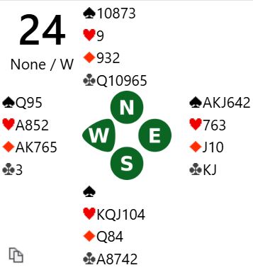 Fra vest kom kløver 6 i utspill til nieren, tieren og kongen. Det ser unektelig ut som det er er et stykke unna ni stikk, spesielt når en med åpne kort vet at hjerterfargen ikke sitter snilt.