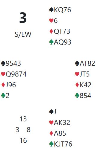 For å være ærlig, etter starten vi beskrev med "suit set" 3 spar fra åpneren i andre melderunde bør vel syd innse at 6NT bør bli sluttkontrakten uansett om vest dobler eller ikke?