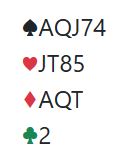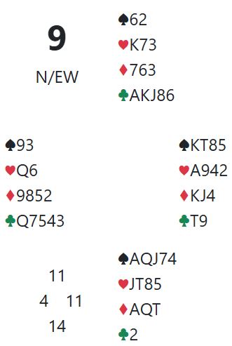 Den doblede kontrakten var helt håpløs for spillefører. Det kan nesten se ut som det vil bli kun et par stikk, for hjerter ess og ett trumfstikk for den trettende ruteren. Men med verdiene i majorfargene måtte det etter hvert bli ett stikk til. Likevel fire doblede bet i kontrakt på ett-trinnet i faresonen, N/S +1100!