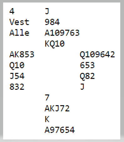 Dette kan du ta som en spilleprøve i kontrakten 5 hjerter. Meldingen gikk forskjellig rundt omkring, men la oss si vest passet som giver, nord åpnet med 1 ruter og øst hoppet inn med 2 spar. Du sa 3 hjerter, vest spratt i 4 spar og makker på nords plass var modig og sa 5 hjerter.