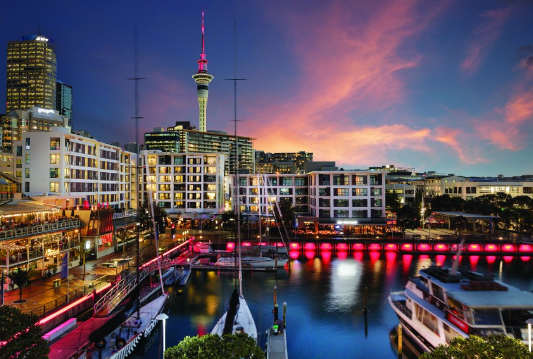 Yrende liv i The Viaduct. Sky Tower i bakgrunnen