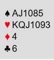 De aller fleste vil si 2 ruter, Michaels Cuebid - minst 5-5 i majorfargene. Det skjedde ved de fleste andre bordene. Man kan anta at nordmannen visste det var jevnt, men jeg vet ikke om han følte noe litt uvanlig måtte til i det siste spillet. Han fant dog en melding som er ganske spesiell med slike kort: 4 hjerter!