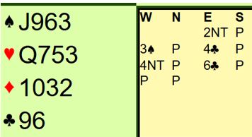 Etter hjerter ut mot 6 kløver gikk det fort. Vests to spar forsvant på hjerteren, og N/S fikk kun ett ruterstikk. CAYNE +1370.