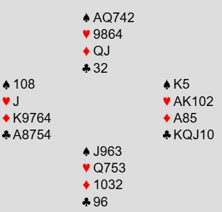 Etter at ROSENTHAL slo ut storlaget NICKELL å på målstreken i kvartfinalen ble det nok en jevn kamp i semifinalen mot et annet profflag, CAYNE. Det så lenge ut som ROSENTHAL hadde full kontroll, men mot slutten ble det spennende likevel. Det var mye pga. et spill vi tar med her fra. Det er fra det siste settet. Ta ROSENTHALs syd sine kort og bestem deg for et utspill mot 6 kløver. Du ser meldingsforløpet til høyre for kortene: