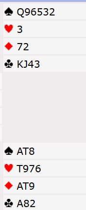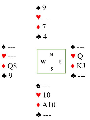 Idet spar 9 ble spilt oppstod en tosidig skvis. Øst som måtte kaste før syd måtte holde hjerteren sin og følgelig gå ned på singel ruter. Da forsvant hjerter 10 fra syd, og det var vest sin tur. Han måtte holde kløveren og derfor forsvant en ruter fra han også! Dermed satt ruteren 1-1 til slutt, og ruter 10 ga det tiende stikket. Pluss 590 ga 12 IMP siden N/S spilte 4 spar udoblet med en bet ved det andre bordet.